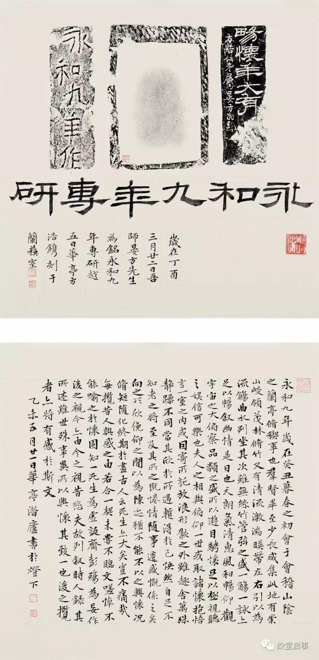 题跋中有一件来楚生先生为唐云先生砖砚题铭的作品可谓凝聚了三代人的艺术追求。唐、来两位大师为童衍方先生的授业恩师,如今童先生帅弟子共同题跋,可见金石艺术在童门得到传承与光大,正是“楮墨千载,金石永年”。