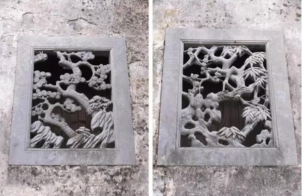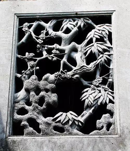 松石、竹梅图漏窗,是安徽黟县西递村西园中的一对石雕漏窗。两株奇松斜立于嶙峋怪石之上,十分刚劲有力。“竹梅图”漏窗上,弯竹梅影,婀娜多姿,静中有动,画中有诗。