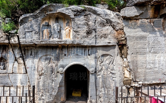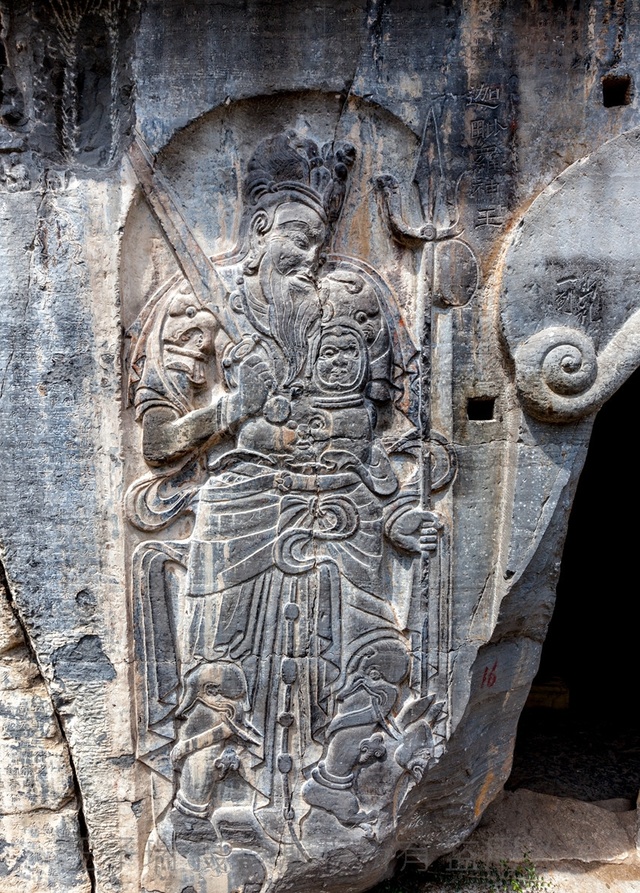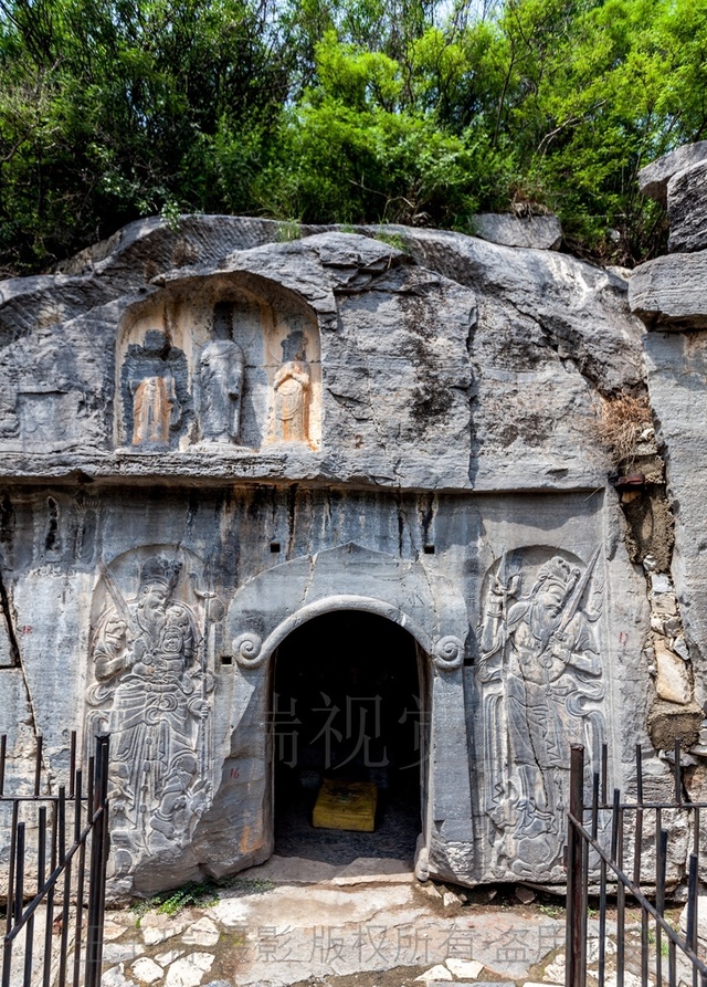 2017年7月30日,河南省安阳县善应镇灵泉寺石窟群,大住圣窟门口的门神雕像近两米,身披铠甲,手持武器,神色威严。据考证,中国的门神就是从此而起源,其意图是有了门神可以保平安。(王子瑞 摄)