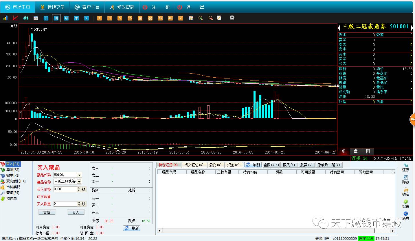 文交所实际就是让参与者像炒股一样投资邮资品、钱币、磁卡等收藏品,从上面的截图可以清晰看出其也有类似股票的价格走势图,多数文交所都是实行T+0的模式进行买卖,也就是在一天内对某一个品种可以不限次数买进卖出。